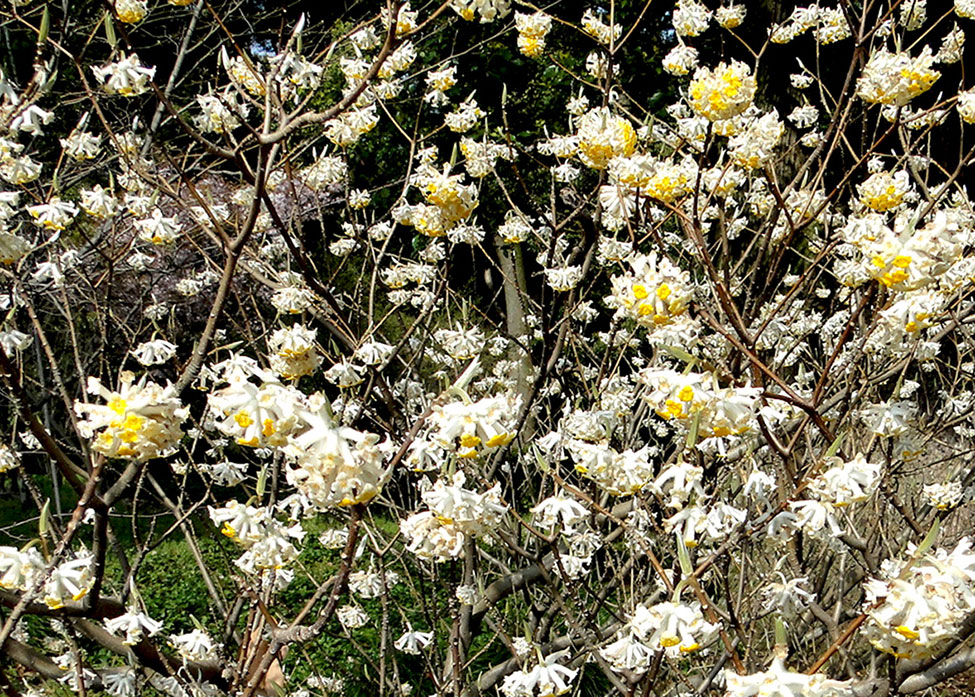 La mitsumata es una fibra más suave y corta, con un tono cálido. Aunque también se cultiva, la mitsumata tarda de 3 a 5 años en regenerarse, lo que la convierte en un papel más caro.